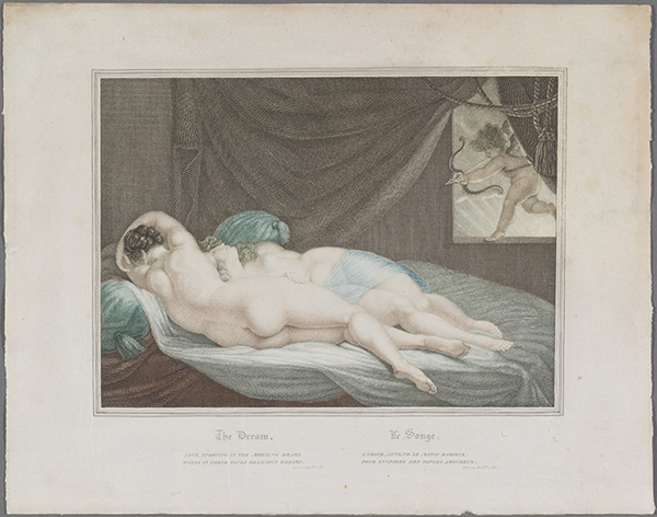 Weinglass states that this engraving is “after a miniature by Moses Haughton of a sleeping girl seen from the back,” the miniature in turn “based on Fuseli’s painting, Fairy Mab Appearing to Two Sleeping Girls.”D. H. Weinglass, Prints and Engraved Illustrations by and after Henry Fuseli (Aldershot: Scolar P, 1994) 340-41, #297. The differences between this supposed model and the pl. are extensive, including the substitution of Cupid for Fairy Mab. Either Haughton made many modifications in the design (at Fuseli’s direction?) or he used a different model. Two uncolored impressions in the published st., inscribed in the pl. “from a miniature painted by Moses Haughton” and without reference to Fuseli, are in the British Museum, registration nos. 1867,0309.1719 and 1867,1214.239. Both impressions include an imprint, “London, Published Octr. 1. 1820 by W. J. White, Brownlow Street, Holborn.”