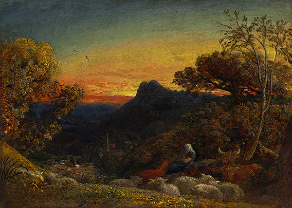 A Sheepfold at Sunset. Watercolor, 24.0 x 44.0 cm., inscribed “S. Palmer [18]71.” Allocated in 2019 to the British Museum by Arts Council England in lieu of taxes.For the allocation of this work and The Return from Gleaning, see Cultural Gifts Scheme & Acceptance in Lieu (London: Arts Council, 2019) no. 34, both works illus. See <https://www.artscouncil.org.uk/publication/cultural-gifts-scheme-acceptance-lieu-annual-report-201819>, accessed 13 Sept.
