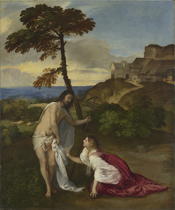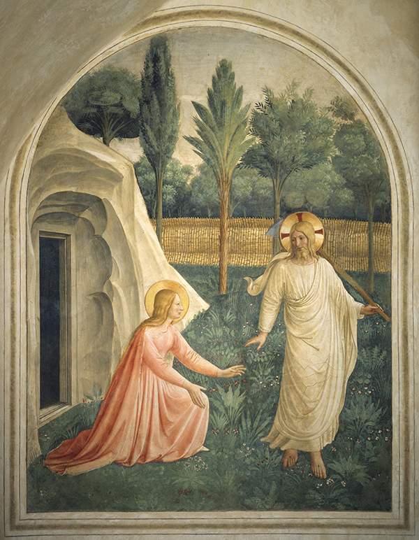 In 1805, Blake painted the beautiful, solemn watercolor The Magdalene at the Sepulchre for his friend and patron Thomas Butts (illus. 1). It illustrates a scene from the resurrection narrative in the gospel of John, capturing the moment before Mary recognizes that the figure who appears to her, outside the tomb, is the risen Jesus: But Mary stood without at the sepulchre weeping: and as she wept, she stooped down, and looked into the sepulchre, And seeth two angels in white sitting, the one at the head, and the other at the feet, where the body of Jesus had lain. And they say unto her, Woman, why weepest thou? She saith unto them, Because they have taken away my Lord, and I know not where they have laid him. And when she had thus said, she turned herself back, and saw Jesus standing, and knew not that it was Jesus. (20.11-14)All quotations from the Bible are from the King James Version, unless otherwise noted. The scene continues with an exchange between Mary and Jesus in which she at first mistakes him for the gardener and then recognizes him as her teacher (“Rabboni”) once he calls her name. Jesus tells her not to touch him because he has not yet ascended, then commissions her to inform the disciples of his resurrection and imminent ascent (20.15-18). This dialogue serves as the source of an extensive iconographic tradition in Western art, the Noli me tangere (“Touch me not”), treated by Giotto, Fra Angelico, Dürer, Titian, Correggio, Michelangelo, and Rembrandt, among others (see illus. 2-4).Nancy lists over forty paintings (103-05). The Noli me tangere imagery traces back to illuminated manuscripts, altarpieces, and wall paintings in the ninth to tenth centuries (Benay and Rafanelli 20, 149).