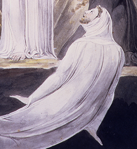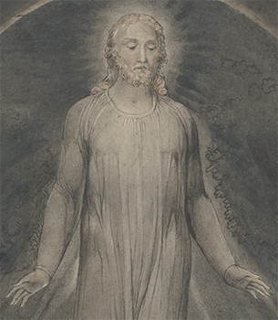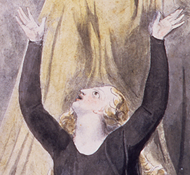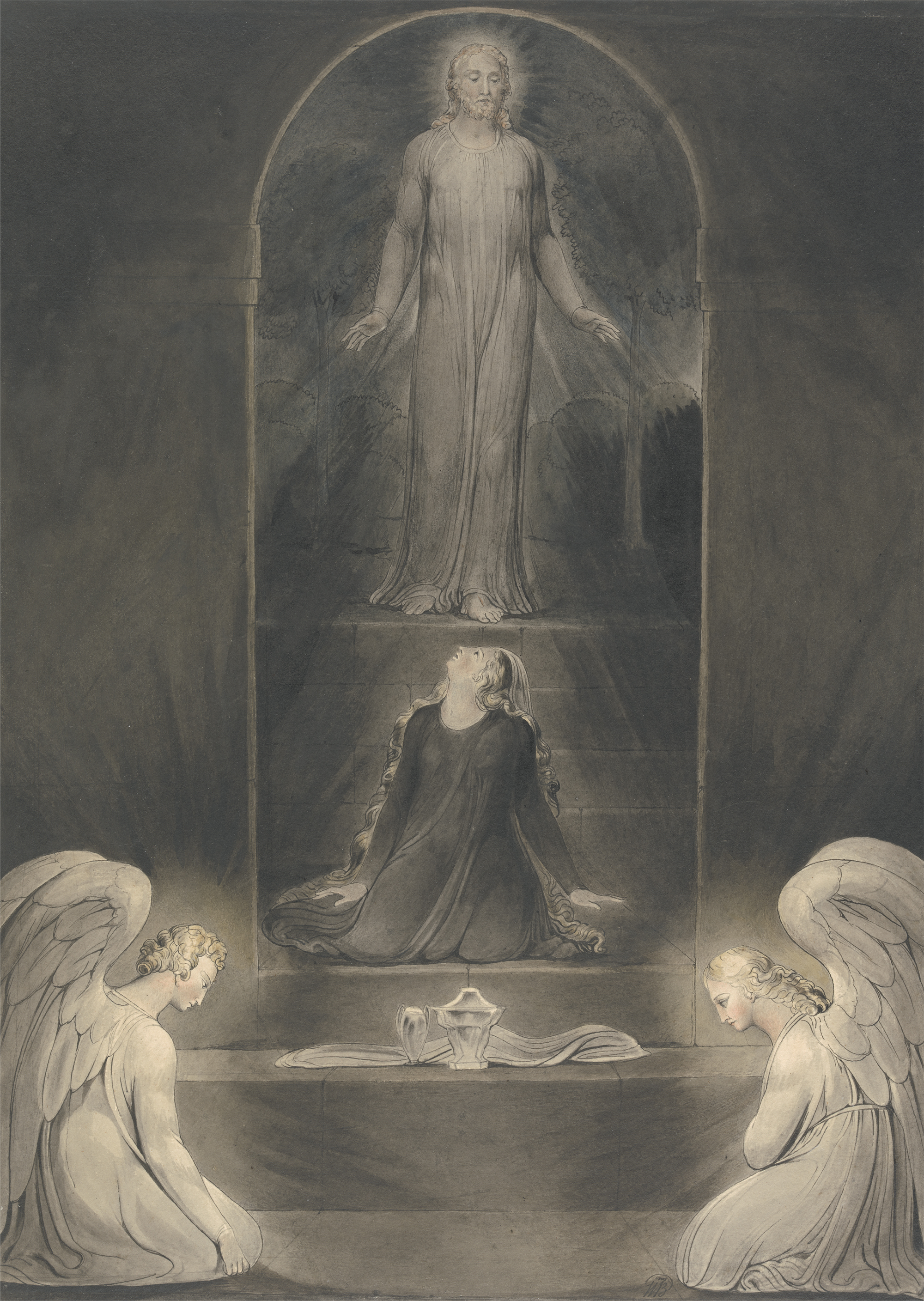 The Magdalene at the Sepulchre is a consummate example of Blake’s incarnational aesthetic and a striking visualization of his interpretive approach to scripture. By choosing to illustrate this specific episode from John’s gospel, he invokes the illustrious Noli me tangere tradition while departing from it, or, more accurately, by refusing to enter it at all. In his book on this tradition, Jean-Luc Nancy provides insight into Blake’s dual iconographic and exegetical strategy. He observes that painters are drawn to this scene from John “because it puts into play a particularly delicate and complex exercise of vision” (21). Jesus appears in a transitional state: John portrays him as entering a dimension “from which alone comes glory,” a glory whose radiance can be seen “only insofar as it is received and transmitted” (17). Mary Magdalene is the first to receive and to transmit this glory, and in the language of Paul, she is “changed into the same image from glory to glory” (2 Corinthians 3.18). She too appears in a transitional state, on the cusp of a profound personal transformation that is at the same time a momentous historical one. At the threshold of moving from an earthly to a spiritual intimacy with Jesus, she struggles to distinguish his divine body from his natural one, compelled to enter a new relationship with him that is not dependent on physical contact. Mary’s experience is thus symbolic of Christianity at the crossroads of the pre- and post-Easter eras. Like Jesus, she cannot stay at the tomb: she must rise to report her revelation to the other followers and inaugurate a new stage of the faith. But Blake does not illustrate this end to the story, choosing to dwell on the uncanny inception of the Magdalene’s vision before it can be contained within a church or reduced to a moral tale. It is Mary’s imagination that enables her to pass the limits of possibility and, like Paul on the road to Damascus, to manifest the divine body—as Blake does in this work of art.