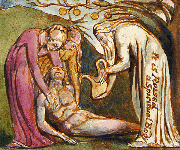 Simon Jarvis comments that while Blake develops Paul’s concept, he alters its meaning: the spiritual body in Paul is raised after the death of the natural body, while for Blake “the spiritual body is the real one, now and eternally” (13). Jarvis does not refer to John, but he suggests that Blake adopts the more immediate or “realized” eschatology of John instead of Paul’s focus on temporal sequence.It should be noted that in Romans (6.9) and Colossians (3.1), Paul expresses a view similar to John’s in saying that followers are “raised from the dead” through the experience of baptism. These conceptions are in tension in Paul’s work. In John, Jesus announces that the “hour is coming, and now is, when the dead shall hear the voice of the Son of God: and they that hear shall live” (5.25, emphasis added). In his visual exegesis of these texts, Blake is focused not on the nature or status of Jesus’s risen body but on the centrality of transformation, coming to a different intellectual and ethical understanding of life through visionary perception.