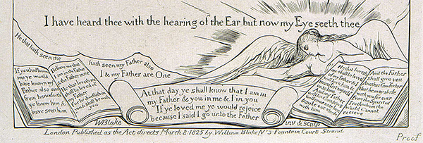 Blake’s reference to Jesus manifesting himself comes from the farewell discourse in John (14-17), a major theological address that scholars view as a key for interpreting the Magdalene’s encounter with Jesus.See Brown (1012) and de Boer (172-76). Rowland comments on the importance of this discourse to Blake’s Job engravings, plate 17 in particular, citing an inscription on the theme of mutual indwelling from the scroll in the lower margin: “At that day ye shall know that I am in / my Father & you in me & I in you” (Blake and the Bible 60). Rowland emphasizes that the visual appearance of God/Christ to Job and his wife dominates the design of the plate, though the lower portion includes a medley of verses from John 14 that insist on the need for visionary experience in realizing this theme. The medley is headed by the caption for the central image, “I have heard thee with the hearing of the Ear but now my Eye seeth thee” (Job 42.5), indicating the verse’s dual visual and thematic importance to the plate (illus. 10).