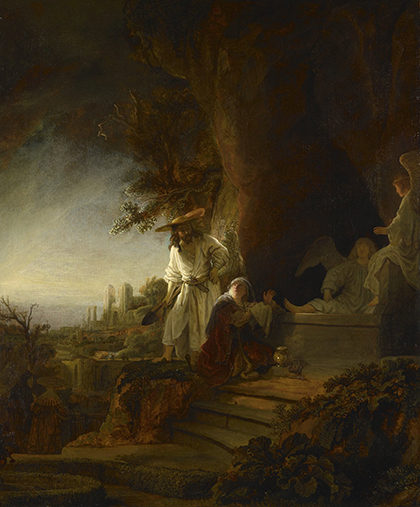 A further observation about the composition of the design can open other dimensions of meaning that go to the heart of Blake’s Christology and aesthetics. The scene within and outside the tomb is suffused with radiance, illuminating the darkness with remarkable yet subtle power. Light emanates from Jesus’s head and from his chest and hands. It also is visible through the arched doorway, appearing in the sky behind him and softly brushing the outline of the bushes (or tombstones), suggesting the arrival of the new dawn. Traditionally Jesus is the source of light, visually and metaphorically, although here a conceptual disruption occurs. It is striking how much light comes from within the tomb. It shines most vividly on or from the two angelic bodies, especially their heads and arms, and gleams off the walls, moving upward to illuminate the Magdalene’s face, neck, and hands. As Morton Paley suggests, the radiance “cannot come from a single external light source but must be inner and spiritual.”Paley also states that Blake’s treatment is “a spiritual counterpart” or contrary “to Rembrandt’s chiaroscuro” Christ and St. Mary Magdalene at the Tomb (illus. 4), in which Jesus and the Magdalene are illumined by natural light (56). Yet Rembrandt anticipates Blake in depicting Mary’s inner struggle, her “state of startled confusion” (Dykema 255). In related terms, W. J. T. Mitchell states that for Blake, pictorial space exists as an “extension of the consciousness of the human figures it contains” (38). In this sense, the angels fulfill a traditional function as divine messengers and represent an aspect of Mary’s experience. Exegetically, Blake follows John in associating the angels with Mary, not with Peter and the “beloved” disciple, who are the first to enter the sepulchre but do not see the angels. The angels’ question—“Woman, why weepest thou?”—registers her inner struggle, her fear and grief at finding the tomb empty. It also triggers the impulse that leads Mary to turn toward Jesus. As they are placed prominently in the design and reflect the brightest light issuing from the tomb, they help highlight the revelation that emerges in Mary’s exchange with the risen Jesus.