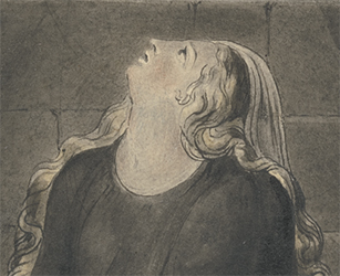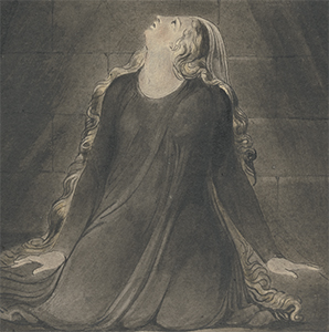 In The Magdalene at the Sepulchre, Blake presents Jesus in a fairly traditional manner. He wears a seamless gown, has long, curly hair and a beard, and a nimbus or halo emanates from his body. Blake places him at the top center of the design, standing on a wall outside the tomb above and behind Mary, facing forward and looking down toward her. His left foot, imprinted with a stigma, steps toward the edge of the wall, and stigmata are slightly visible on his hands. Perhaps the most intriguing feature is the gesture he makes with his hands, which deviates from tradition by not seeking to elude or ward off the Magdalene. His palms face downward but are slightly open, perhaps showing his wounds. Below the Magdalene, on a ledge inside the tomb, are a white cloth, perhaps the linen clothes Jesus has put off, and two vessels—an urn and a jar. Two angels, kneeling in rapt devotion, stare solemnly at the ground where Jesus had lain, their winged bodies giving off intense light and their necks and faces flushed with a rosy hue.Like the angels in the frontispiece to Blake’s illustrations for Young’s Night Thoughts, the angels avert their gaze from the risen Jesus, in contrast to the Magdalene. Mary kneels on the step leading into the tomb and wears a black gown; a veil partly covers her long, curly hair and her arms are at her side, palms down. Most strikingly, she turns and stretches her neck and head up and to the right to look at Jesus, her lips pale with surprise and bewilderment (illus. 5). Blake has chosen to illustrate the most suspenseful moment in John’s resurrection scene (20.14).