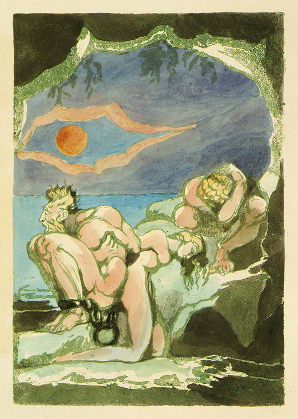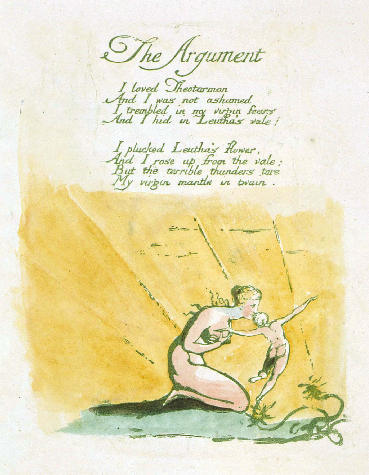 After the rape, Theotormon appears and folds “his black jealous waters round the adulterate pair / Bound back to back in Bromions caves terror & meekness dwell” (2.4-5, E 46), the scene displayed on the frontispiece.