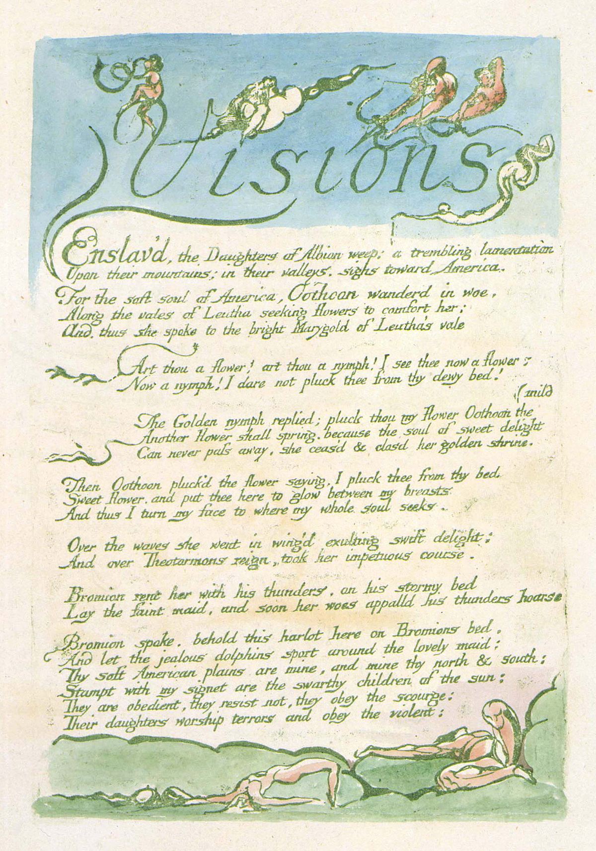 Yet in Blake’s representations of the erotic interactions between men and women, both textual and visual, the concept of self-annihilation does not always adhere to a unilaterally positive tenet of selfless sacrifice, one “that is echoed in every kindness any man performs for another” (Doskow 164). I argue, therefore, that aside from being a central factor in Blake’s revisionist Christian system of the “human form divine,” self-annihilation is a major source of eroticism in his portrayal of unconventional sexual experiences. Self-annihilation as an erotic phenomenon is empowered by the violent alteration of human subjectivity and the dissolution of social and biological preexisting identity. Blake’s designs of Oothoon and Theotormon in Visions exemplify this alternative aspect, as this essay attempts to demonstrate.