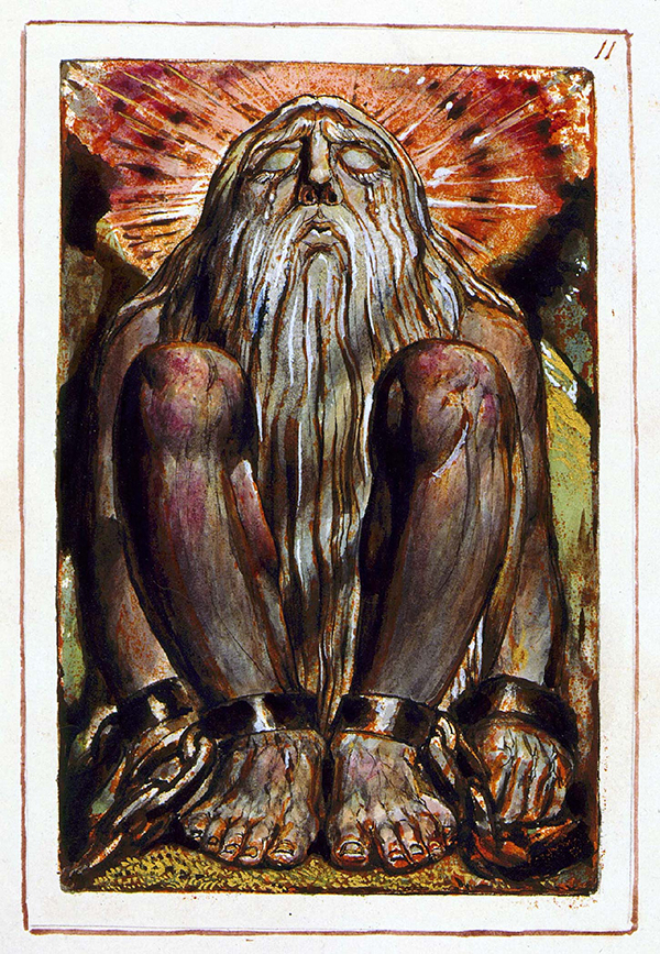 In “Gates,” Urizen becomes a prisoner too, confined to his body by Los: “All things come from the one / Now you are the victim.” The one from whom all things come can be either Urizen or Los, as both are creators, but “now you are the victim” can only refer to Urizen, who has become a prisoner himself. The embodiment of horizon, the creator of boundaries and limits, is incarcerated in a body and chained up. The line that follows—“Carried by the wind, rooted in the ground”—reinforces my reading that the song retells the narrative of Urizen at this point, since it hints at the creation process of Urizen’s body. His body parts are repeatedly exposed to wind: “upon the winds” (object 12, line 43), “hiding carefully from the wind” (object 13, line 17), and “hanging upon the wind” (object 13, line 29). The roots in “Gates” may be seen as extensions of the branches in Urizen: “His nervous brain shot branches / Round the branches of his heart” (object 13, lines 13-14). “Rooted in the ground” also describes the full-page design on object 11, which shows Urizen chained, firmly fixed to the ground.