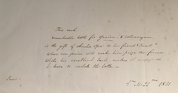 In 1986 William W. Heath announced a most exciting acquisition for the Mead Art Museum at Amherst College, the gift of Dr. and Mrs. K. Frank Austen (class of 1950): a copy of Blake’s Illustrations of the Book of Job (1826) that had been known earlier in the twentieth century but whose location had proved elusive for a number of years. It is readily identifiable by its inscription: “This work remarkable both for Genius, & Extravagance, is the gift of Amelia Opie to her friend David, whose own genius will make him prize the former, while his excellent Taste makes it impossible for him to imitate the latter—Paris—4me Mo 22me 1831” (see illus. 1).Blake’s plates can be viewed online at <https://museums.fivecolleges.edu/detail.php?museum=all&record=0&v=2&s=AC+1983.44&type=all&t=objects>. The location of this copy was unknown to Bentley when he prepared the first edition of Blake Records, though he knew of the inscription through a catalogue description from a clipping in the Mellon collection. His transcription gives the presentation date as “Paris, 14me. Mo. 22me. [i.e. Nov. 22nd?] 1831” (602n3). He corrects the date to 22 April 1831 in the second edition (544 and n74), presumably on the authority of Heath.