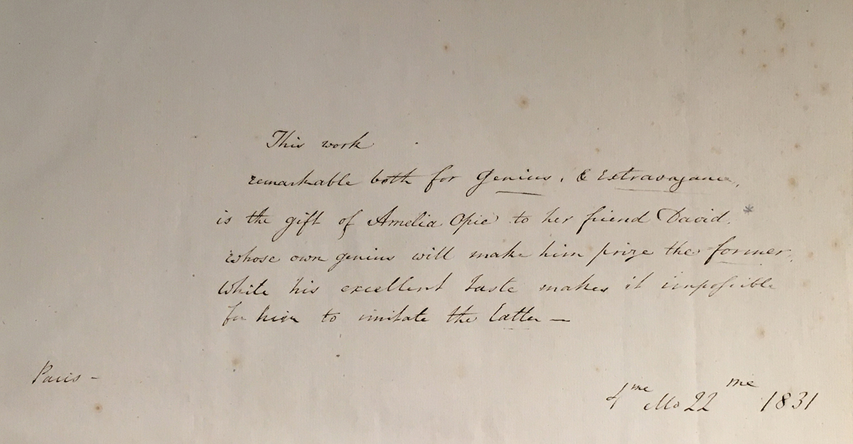 Amelia Opie’s connection with David extended many years after she presented him with Blake’s Job. They remained in correspondence, with letters from 1836 and 1845 suggesting ongoing conversations regarding subjects of mutual concern. Opie also continued to express keen interest in the world of British art. She was delighted when Briggs was elected a full member of the Royal Academy in 1832, and her correspondence with him often touched on gossip from the world of painting. She also traveled to London to attend the annual Royal Academy exhibitions for many years. As Opie’s correspondence illustrates and the inscriptions and bookplates found in this copy of Job confirm, Blake’s works were highly valued by this group of writers and artists, who formed a complex social and commercial network in the nineteenth century.