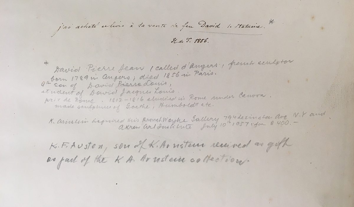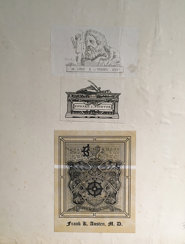 The work is also inscribed “j’ai acheté ce livre à la vente de feu David le Statuaire. H. de T. 1856” and bears the bookplate of H. de Triqueti (see illus. 2-3). Henri, Baron de Triqueti (1803–74), was a sculptor and a contemporary of David; his inscription presumably records a sale that took place following David’s death in January 1856. Both Triqueti and the architect Ambrose Poynter (1796–1886), father of the painter and designer Sir Edward J. Poynter (1836–1919), had married granddaughters of the British sculptor Thomas Banks, the sisters Julia and Emma Forster. The younger Poynter, whose bookplate appears below Triqueti’s (illus. 3), was director of the National Gallery from 1894 to 1904 and president of the Royal Academy from 1896 to 1918. The copy next appears in an Anderson Galleries catalogue of May 1920, Purchases in London and Paris of the Late George D. Smith Sold by Order of His Estate (lot 743, p. 95).Smith, a noted New York rare books dealer who worked closely with Henry Huntington from 1911, died in March 1920 (Thorpe 442). Heath supplements the account of the provenance: “A further inscription indicates that the volume was subsequently purchased (in 1957) from the E. Weyhe Gallery in New York City. Dr. and Mrs. K. Frank Austen ’50 presented it to [Amherst] College in 1983” (59).According to the inscription, Dr. Austen’s father, noted aeronautical engineer and collector Dr. Karl Arnstein (1887–1974), “acquired this through Weyhe Gallery … and Akron Art Institute July 10th 1957 for $400” (see illus. 2).