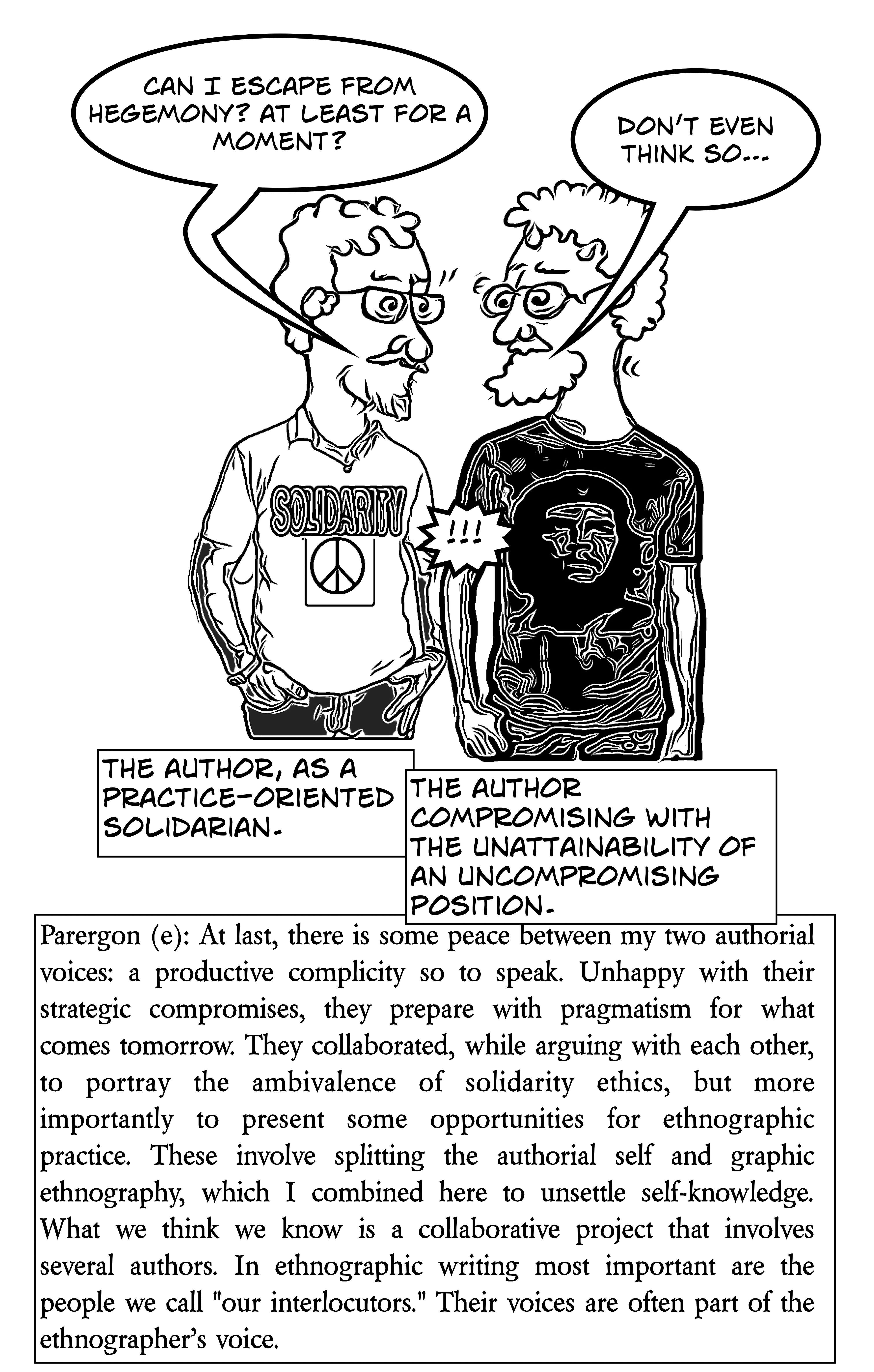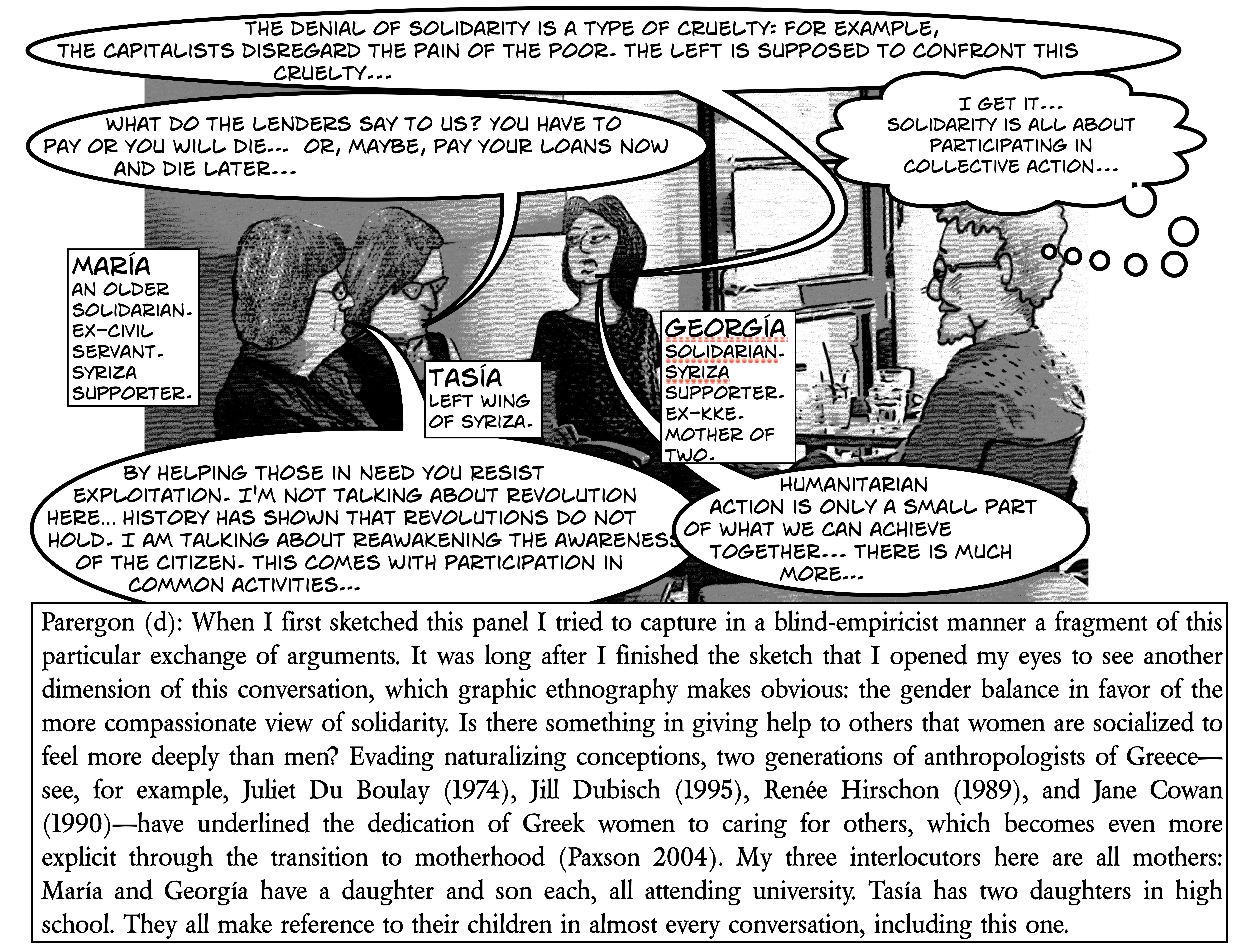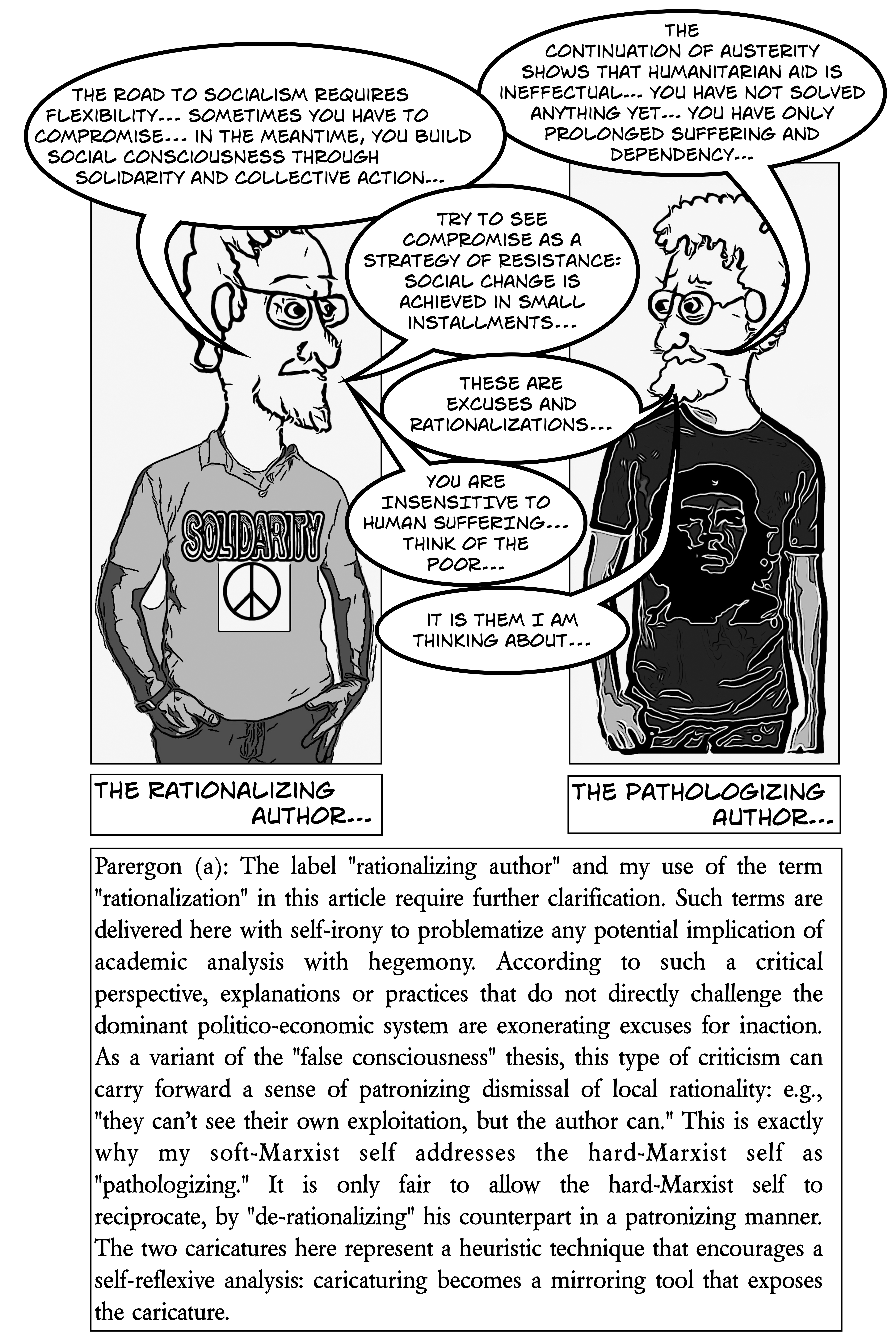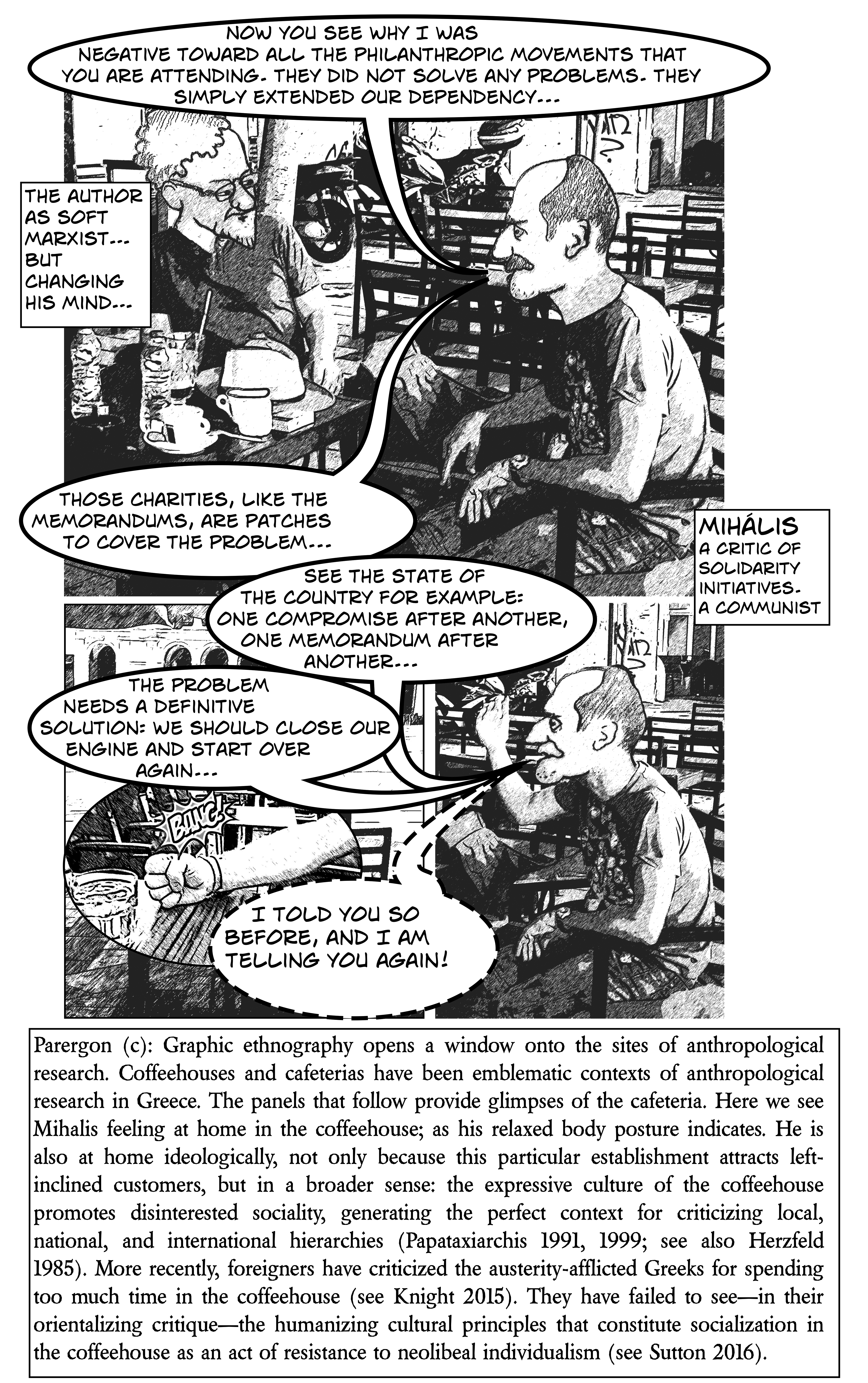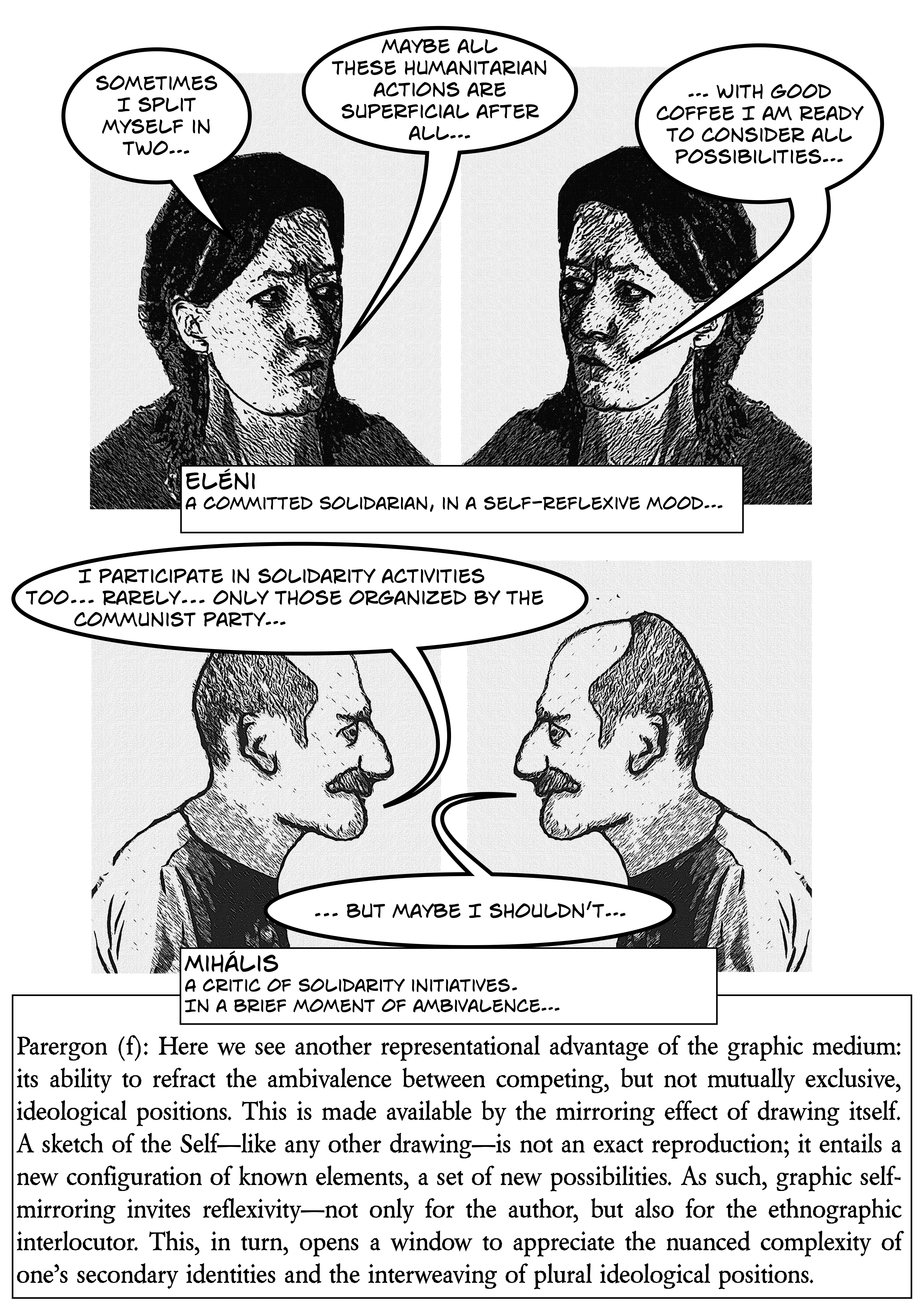 This article introduces an autobiographical analytical tool that aims to elucidate the complexity and interweaving of opposing ideological positions as these emerge in the field and while writing ethnography. The technique introduced makes visible the split of the author’s identity into two: between that of a hard and a soft Marxist, where each authorial self resonates with a particular local perspective. The split and those who have stimulated it—the real-life protagonists in the field—become reanimated and embodied through the self-mirroring representational lens of graphic ethnography. Overall, the article provides an experimental exercise in reflexive Marxist anthropology, which, apart from ethnographic innovation, engages with the ambivalence and codependence of competing arguments about the ethics of humanitarian solidarity in austerity-afflicted Greece. The essay suggests that local arguments about solidarity are coconstituted through pragmatism and productive self-critique in times of protracted austerity. [auto-biographical split; graphic ethnography; solidarity; indirect resistance; reflexive Marxism; Greece]