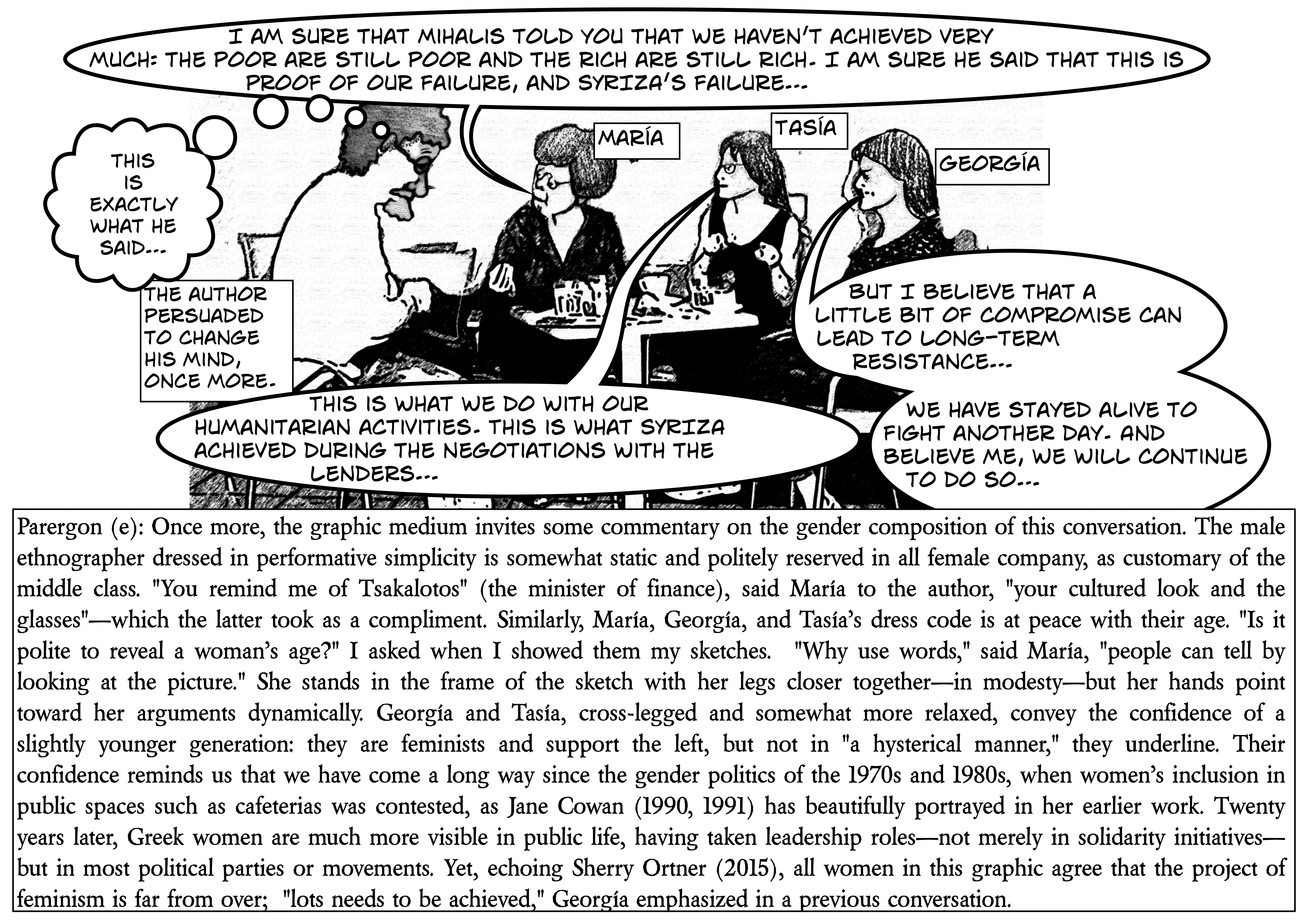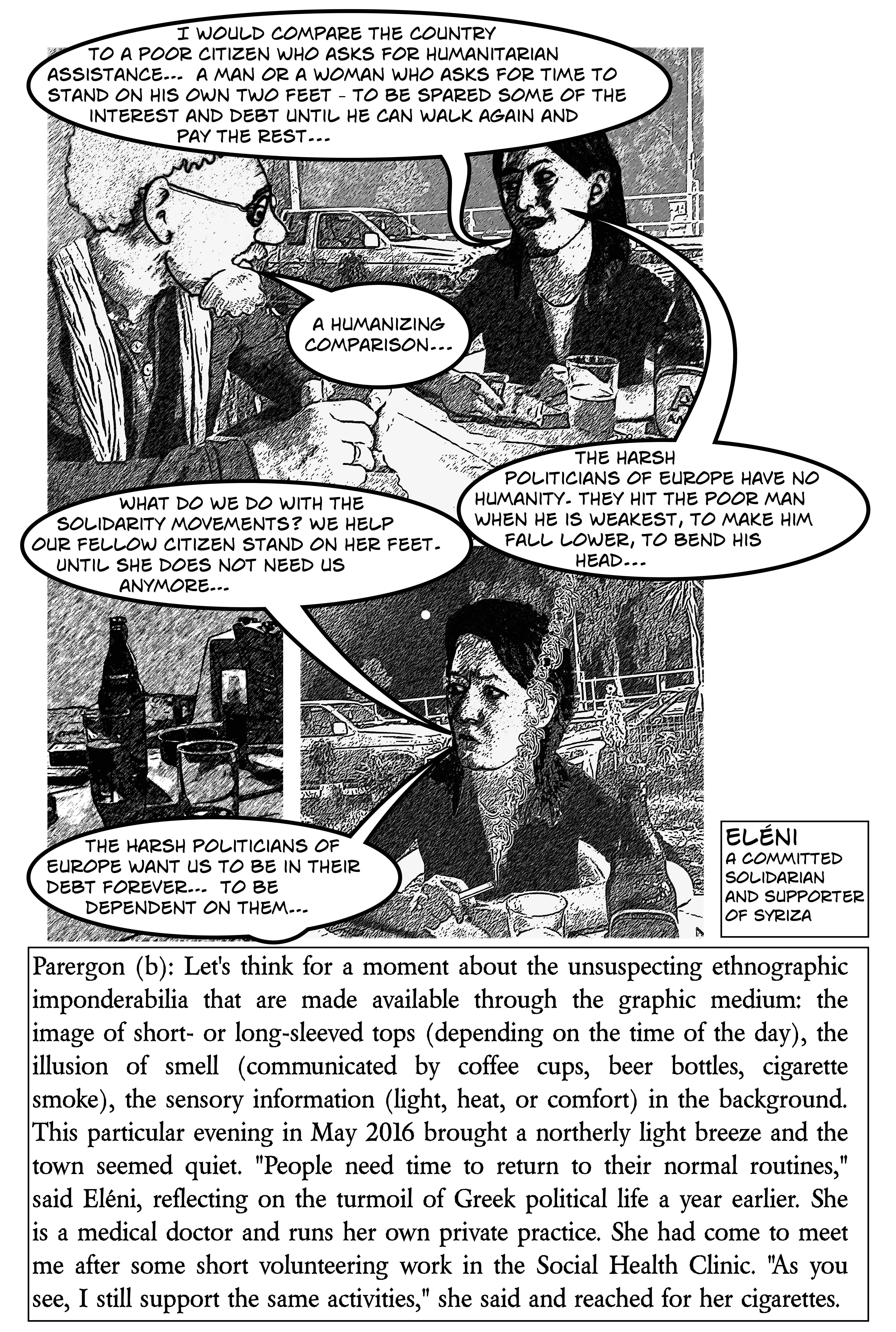 My particular use of graphic ethnography in this article makes available components of the original ethnographic discussions presented as integral to the ethnographic narrative. They reanimate but also destabilize the authoritativeness of ethnographic interpretation, opening, rather than closing, ethnographic imagination (Ingold 2011, 2012). To escape from overidentification with particular positions—a problem related to the topic I tackle here—I have mirrored the emerging dilemmas on one’s self: setting my protagonists, and myself, against their previous views, to escape momentarily from the performative certainty of arguing particular positions. To the extent that the graphic medium trades in reductions, it can—almost as easily—showcase internal complexity, accentuating a sense of incompleteness (Taussig 2011; Theodossopoulos 2016a) as well as a sense of ethnographic openness (see graphic panel below).
