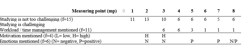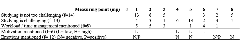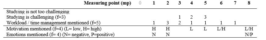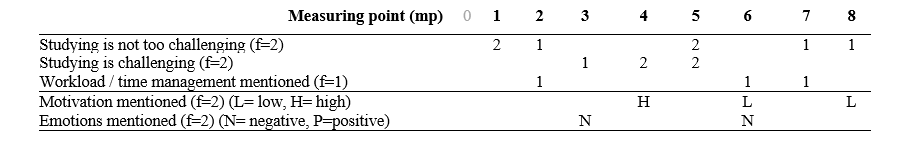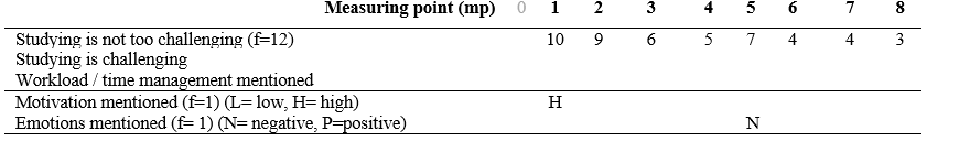 From the qualitative analysis, we identified common themes: perceived feeling of challenge (e.g., with weekly tasks and related materials), workload / time management, motivation , and other emotional experiences. Each student profile is described through these themes and chronologically evolved from the first to the last measurement point (1-8). The initial survey before the start of the course (mp 0) was excluded from open-ended results.