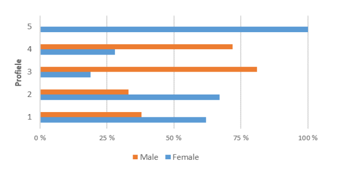 A Chi-Square Test showed that the gender differences between the profiles were statistically significant: χ² (4, 2) = 18.153, p < .001. However, it is worth noting that three cells (30%) had an expected count of less than 5 when the minimum expected count was 1.74. In the “Average”, “Determined”, “Struggling”, and ”Victorious” profiles there were more female than male students (see Fig.2, Table 5).