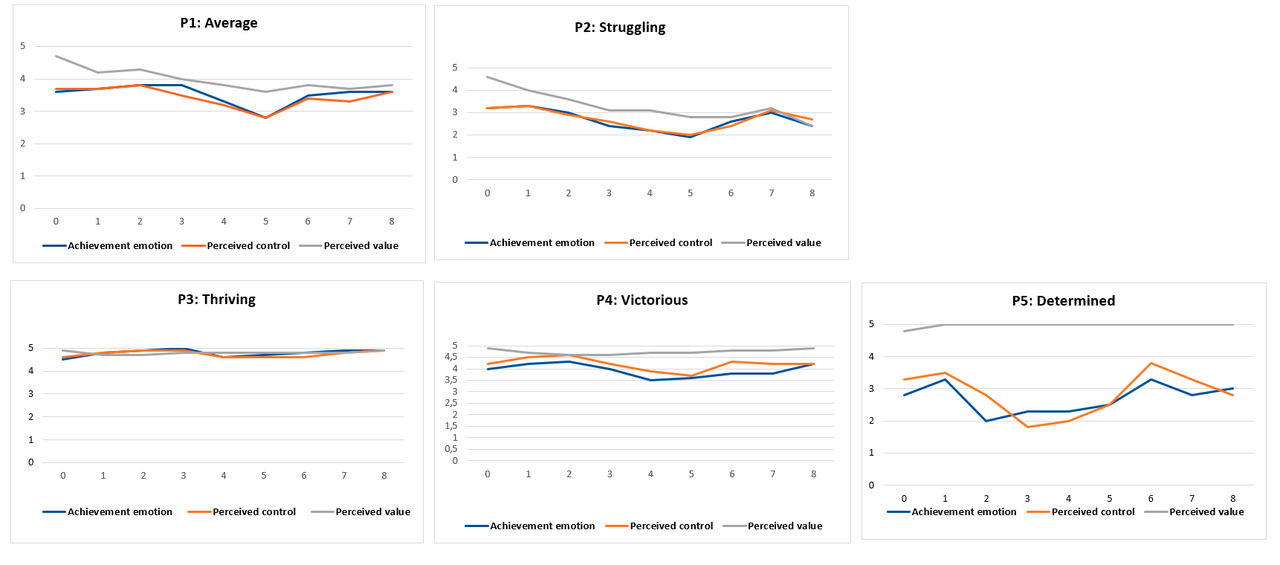 All the students who valued the course had more stability in their emotions and overall, more positive emotions and a better course performance. Students experienced joy and pride when they valued the course outcome and felt in control. They felt enjoyment when they were interested and confident. "Most importantly, when students had problems with a weekly task, changes in their emotional reactions and perceived control sometimes were misaligned. For example, the “Victorious” students reached the lowest point in their emotions at measurement point four, yet their perceived control continued to decline until measurement point five. Moreover, the “Average” students’ perceived control and value showed a declining trend at the third measurement point, while their emotions value showed decline only at the measurement point four. This lack of synchrony in these changes does not align with the assumed model in CVT, where emotion is seen as an outcome of values and control. Further longitudinal studies should examine with more robust measurements whether this observation of non-synchrony can be repeated.