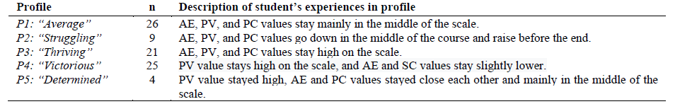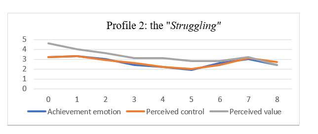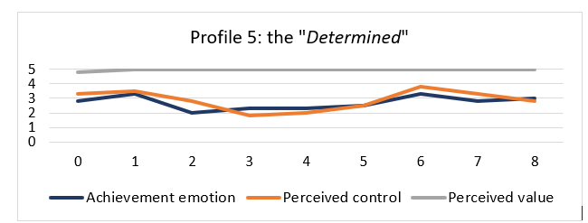 In all profiles, AE and PC values (M and SD) stayed lower than PV during the whole course (see Table 4). In the "Determined" profile, it appears that a decrease in AE is followed by a decrease in PC, and in the "Struggling" profile, PV, AE, and PC decrease or increase in similar patterns (see Fig.1). AE and SC values stayed mainly lower in the "Determined" profile and in the "Struggling" profiles all the values (AE, PC, PV) stayed lower than in the other profiles during the whole course (see Fig.1).