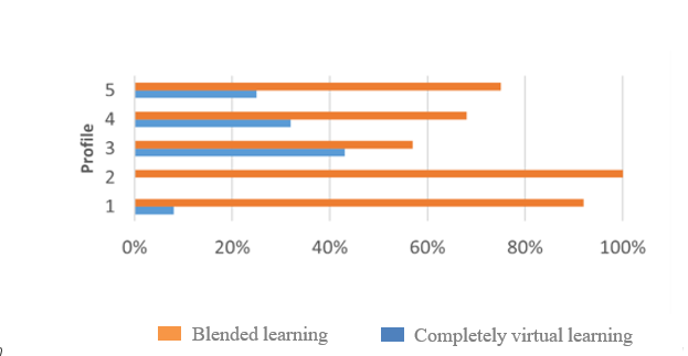 Furthermore, there were differences between the profiles based on form of course implementation (blended, fast track): χ² (4, 2) = 11.755, p < .05. In every profile, more students chose the blended form of course implementation than fast track. In the “Thriving” (43%) and “Victorious” (32%) profiles, the proportion of students who had chosen fast track was the highest (see Fig.3, Table 5). However, the results should be interpreted with caution as four cells (40%) had an expected count of less than 5 when the minimum expected count was .94.