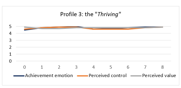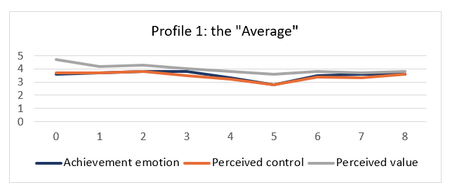 In the first profile, the “Average”, all the values (achievement emotions, perceived control and perceived value) remained at an average level throughout the course and were at their lowest at measuring point five (mp 5) (see Fig. 6).