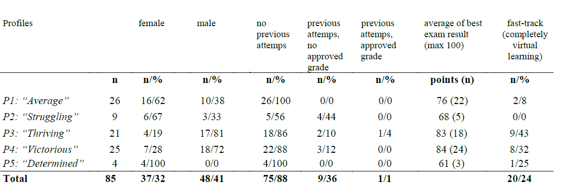 Secondly, we found significant differences according to gender, and differences according to form of course implementation. In the “Average” (62%), the “Determined” (100%), and the “Struggling” (67%) profiles, the females were the majority with lower outcomes (see Table 5). The result corresponds to previous findings indicating that female students have a higher prevalence for emotional distress, which often can have a negative impact on exam performance (Cassady & Johnson, 2002; Hembree, 1988). Females have been shown to exhibit higher levels of test anxiety leading to lower course grades (Chin et al., 2017). At the same time, there were more men in highly successful profiles, namely the “Thriving” (81%) and “Victorious” (72%) profiles. Both of these profiles had more fast-track (totally virtual learning) students. Prior research suggests that students who do not perceive challenges in their learning or performance are more prone to prefer virtual courses than their peers who are struggling with learning and prefer face-to-face courses (McLaren, 2004; Paden 2006; Roach, 2002, Schoenfeld-Tacher et al., 2001).