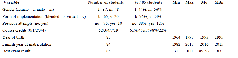 The research was conducted in a half-semester (approximately eight weeks) foundation-level statistics course at a large public research university in Finland. The virtual course had two forms of course implementation: blended learning and completely virtual learning (named “fast track”). The difference between the two options was a weekly face-to-face group meeting for the blended course participants. The course was intended for degree program students and had 450 participants. Eighty-five students volunteered to participate in this study (65 completely virtual and 20 blended learning students). Seventy-two of those students participated in the course exam. Basic descriptive statistics are presented in table 1.