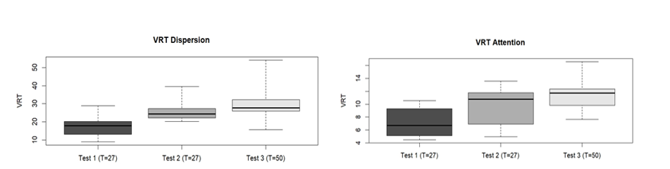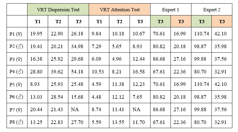 Table 2: Participants (P) VRT Dispersion, VRT Attention for three tests and experts references