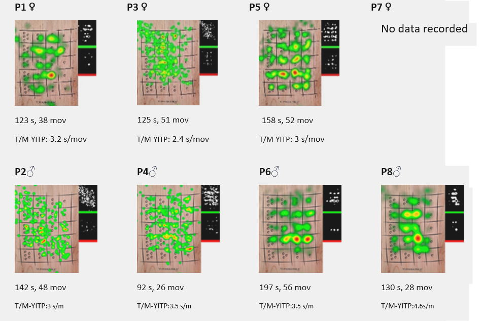 P6 (♂ ): Solved maintaining order from units to tens of thousands (from bottom to top). On Test 2 he solved 5 of 7 sums correctly and his average time for solving sums was 1:22 min. No composite moves were observed. Test 2 needed 2 fewer moves than in Test 1 and did it 1:03 minutes faster. Heat zones remain similar. T/M-YITP fell by 39%.