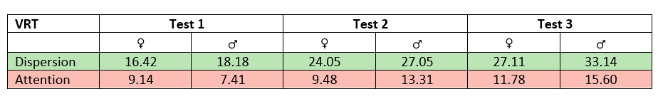 In Table 3 Both women and men showed an increase in VRT for dispersion and attention across all three tests. This suggests that both groups devoted more attention to exploring different areas of the board (dispersion), while maintaining a certain level of concentration on a particular area (attention) as the trials progressed. While both groups showed similar trends, the VRT results suggest that both groups' attention became more dispersed and more focused at the same time as the tests progressed. Although there appears to be a similar pattern, with men scoring slightly higher than women, further analysis is needed to confirm whether there are significant differences between them.