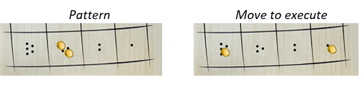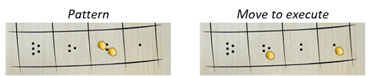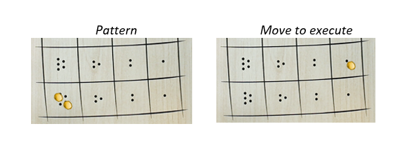 KIKIN movement (box 1, mnemonic: “2 in 1 = 1 in 2”; “3 in 1 = 1 in 3”; “5 in 1 = 1 in 5”) : This movement consists of replacing a group of 5 pieces of box 1 for 1 token in box 5; replace a group of 3 checkers in box 1 with a 1 checker in box 3 and replace 2 checkers in box 1 with 1 checker in box 2, whichever is the case (see figure 5).