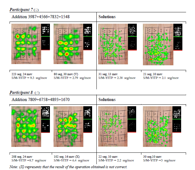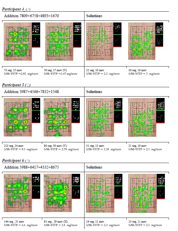 P4 (♂ ): Solved by maintaining order from units to ten thousands (bottom to top). On Test 2 he correctly solved 6 of 7 addition exercises and her average time for solving additions is 51 s. He performed an advanced move, ”Hatun pichana”. On Test 2 he reduced 8 moves and did it 14 seconds faster. Although the T/M-YITP increased, the number of final moves was reduced, which responds to the participant’s use of composite moves. A difference has been seen in the heat points, greater dispersion in the evaluation. He showed great confidence when solving the exercise.