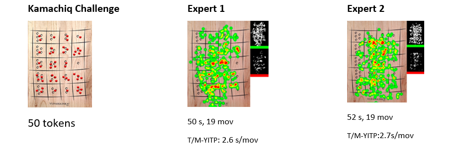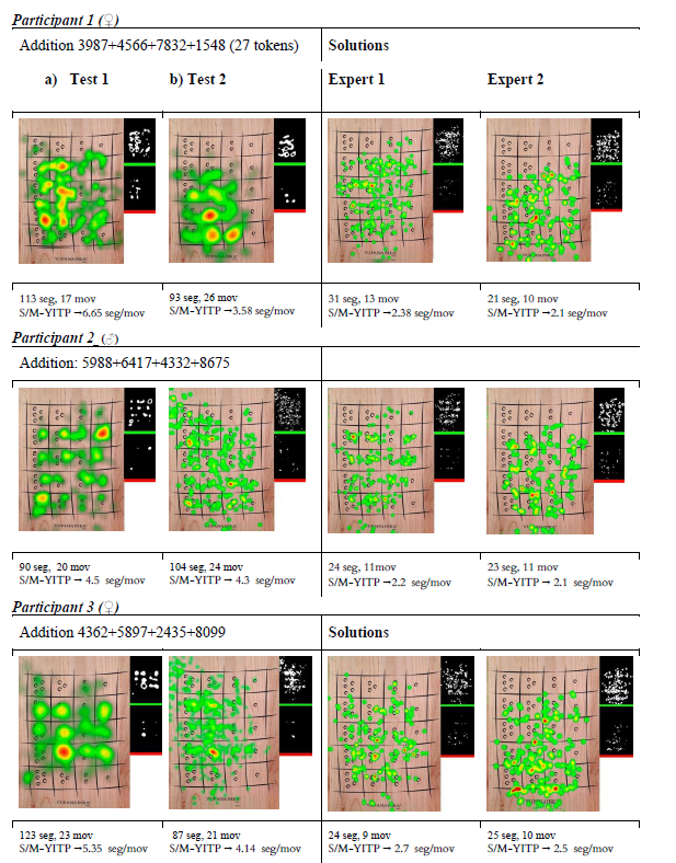 It should be noted that Tests 1 and 2 involved 27 tokens, with the addition arithmetic of four 4-digit numbers, and that this was the same in both tests. Test 3, however, used 50 tokens from the Kamachiq challenge. The results indicate that as novice participants become more familiar with the YITP method, their attention becomes more focused on relevant areas and there is a greater exploration of the entire board in search of potential pattern moves.