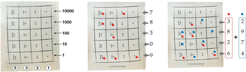 As demonstrated by Dhavit Prem et al., (2022), YITP enables the performance of arithmetic operations through the recognition of patterns formed by tokens on squares and their predefined moves. YITP comprises three types of moves: a) basic moves, which reduce the number of pieces on a square (see Appendix 1), b) expansion moves, which enlarge the pieces on the board when necessary, and c) advanced or compound moves, which are the simplification of two or more basic or expansion moves into a single move. This method eliminates the need for conventional mental arithmetic, while encouraging the development of different strategies comparable to those used in chess (Prem., 2016). This approach diverges from traditional Indo-Arabic mathematics, which was developed by Brahmagupta (590 AD) (Bhattacharyya, 2011; Ram & Ramakalyani, 2022). The execution of YITP arithmetic operations is not constrained by a fixed sequence. The method allows for the implementation of multiple strategies of simplifying operations, either sequentially or in parallel, making it a parallel computational method. To illustrate, in the case of yupana, the sum of numbers must first be represented on the abacus (figure 2c), and then the operations (movements) proposed by the method can be performed as shown in appendix 1.