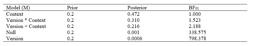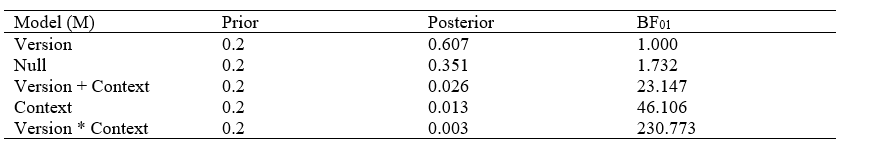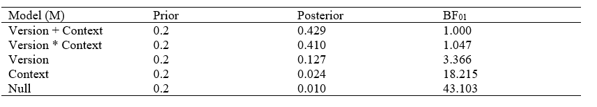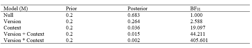 To assess the effect of contextual factors on cognitive learning and motivational outcomes, we compared Bayes factors resulting from Bayesian ANOVAs for the following five models for each outcome variable (efficacy, efficiency, attractivity, stimulation): 1) a null model (containing neither task version nor context as predictors); 2) two single predictor models with either task version or context as predictor; and 3) two models including both predictors once without their interaction and once with their interaction included. These models are denoted below simply as “null”, “version”, “context”, “version + context” and “version * context”, respectively. Prior odds were assigned uniformly over all five models (i.e., prior odds of 20% for each model). Models were compared to the best resulting model in our analyses. All models included age, gender, and student status as random factors to provide some control for their influence because we noted that samples differed across studies (see Table 2), and multimedia learning theory suggests that these factors play a role too for cognitive learning and motivational outcomes (Mayer, 2024).