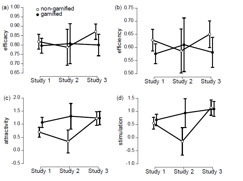 All studies yielded good to excellent reliabilities for the two subscales attractivity and stimulation of the UEQ. In particular, we obtained Cronbach’s α = 0.92 and α = 0.89, respectively, for study 1, α = 0.93 and α = 0.91, respectively, for study 2, and α = 0.89 and α = 0.82, respectively, for study 3.
