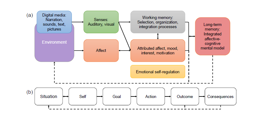 Learning emerges from the interactions among cognition and affect, further providing a conceptual link to learning engagement and motivation. This is especially important as game-based pedagogies are frequently employed for their capabilities in fostering sustained engagement and motivation in learners (Greipl et al., 2020; Ryan & Rigby, 2020). As outlined by Urhahne and Wijnia (2023), many, if not all, motivational theories share the same basic motivational model depicted in Fig. 1(b), based on the general model of motivation by Heckhausen and Heckhausen (2018). Similar to the ICALM (Plass & Kaplan, 2016), the model emphasizes that motivated behavior emerges from interactions between learners and the situation in which they find themselves. All subsequent concepts to describe motivated behavior [goals, actions, outcomes, consequences in Fig. 1(b)] emerge from this interaction and are evaluated in relation to it. Motivational theories like expectancy-value theory (Eccles & Wigfield, 2020), self-efficacy theory (Bandura, 1997), or self-determination theory (Ryan & Deci, 2019) then differ in how they conceptually fill, relate, and weigh the different parts of the motivation-action cycle against each other. However, they share their roots in this interaction between learners and the learning situation.