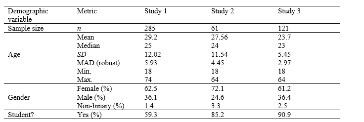 Table 2 summarizes the demographic information available for the participants of the three studies. Regarding demographic information, age, gender, and whether participants were currently enrolled university students, were assessed in all three studies. Considering student status, we did not differentiate between graduate and undergraduate students. Furthermore, the information was entirely based on self-report, that is, we did not verify with the universities about participants’ student or enrollment status.