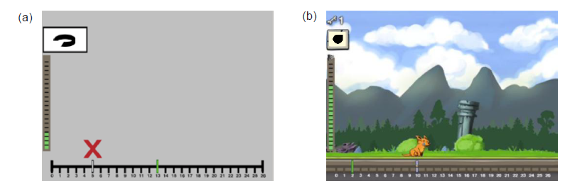 Regarding the design of the learning task, all three studies used two identical design versions, one employing some additional game elements (= gamified version), one representing a control version without those game elements (= non-gamified version). Screenshots of the two versions are provided in Fig. 2. The difference between gamified and non-gamified task versions was entirely based upon the inclusion of game elements, a core aspect also in game-based learning (Plass et al., 2015). The game elements comprised of (i) visual aesthetics (a scenery with trees, sky, mountains, etc.), (ii) a narrative of a dog taking a stroll in the woods looking for bones, and (iii) an incentive system (i.e., the “bone count” displayed in Fig. 2(b) in the upper left corner). In the gamified version, the slider’s movement and placement were also accompanied by animations of the dog walking and digging (searching for a bone), respectively. Choosing a correct number would result in the dog wagging its tail in the gamified task version, while in the non-gamified task version, only a green check mark would appear. In the gamified task version, choosing an incorrect number would result in the dog shedding tears, while a red X-sign would appear in the non-gamified task version (see also Fig. 2).