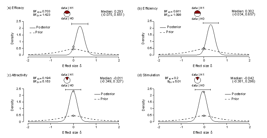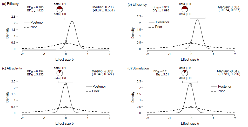 In Fig. 3, we depict the means and their 95% credible intervals for (a) efficacy, (b) efficiency, (c) attractivity, and (d) stimulation depending on context and task version. We find that for efficacy and efficiency, neither context nor task version seem to matter much, because all credible intervals yield substantial overlap with each other. The data does not provide any evidence for an interaction between context and task version, either for efficacy or efficiency (see Tables 3-4), respectively. In fact, for efficacy (Table 3), the best model is the null model that does not include any of the two predictors. Except for the single predictor model with task version as a predictor (2.6 times less likely than the null model according to our data), the data provides strong to decisive evidence against all other models. The same is the case for efficiency (Table 4), in which case again the single predictor model with task version as predictor and the null model are most likely from all considered models and for the given data, providing strong to decisive evidence against all other models. Overall, we conclude that for predicting efficacy and efficiency in the used learning task contextual aspects do not contribute much if anything at all. Regarding our first research question (Section 1.4), we thus conclude that cognitive learning outcomes resulting from this task do not differ much between the different contexts realized by the three experimental settings. Regarding our second research question, the results further suggest that the influence of gamification on cognitive learning outcomes does not depend much on those contextual aspects.