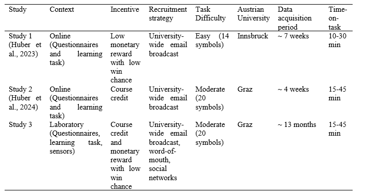Although all studies were similar to each other, they also differed in several respects. This will be clarified in the following sections. Table 1 provides an overview of features by which the compared studies differed. Except for one task-inherent feature (task difficulty and directly related to it: time-on-task) all features in Table 1 refer to the broader study context and are not inherent to the learning task common to all three studies.
