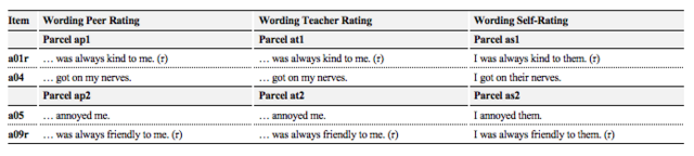 Note. Items a01r and a09r had been positively worded so that the raters could describe the targets in a favourable way in order to prevent a negative stigmatisation of the target student due to the survey. The original answers were afterwards recoded into inverted values (r).