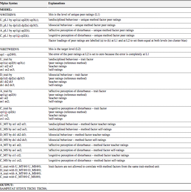 Following Eid et al. (2008) and Carretero-Dios et al. (2011), a two-level CT-C(M-1) model was set up and calculated in Mplus 8.0 (Muthén & Muthén, 2017). The model comprises four target-specific traits (undisciplined and dissocial behaviour, affective and cognitive perception of disturbance) which have been measured by three different methods (teacher, peer and self-ratings). The most important principles of the modelling are explained in this section. Further explanations follow in the results section and in Appendix B.