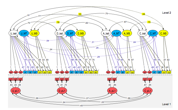 The other three constructs have been modelled in the same way. The white ovals illustrate the trait factors of dissocial behaviour (D_trait), affective perception of disturbance (A_trait), and cognitive perception of disturbance (C_trait). The blue ovals represent the teachers’ method factors (_MT); the yellow ovals symbolise the self-ratings’ method factors (_MS); the red ovals at L1 represent the peer ratings’ unique method factors (_pL1). The red boxes at L1 stand for the unique peer ratings (dp1–dp3, ap1–ap2, cp1–cp2); the small red ovals at L2 illustrate the aggregated scores (labelled identically as the unique ratings). The blue boxes represent the teacher ratings (dt1–dt2, at1–at2, ct1–ct2); the yellow boxes represent the self-ratings (ds1–ds2, as1–as2, cs1–cs2).