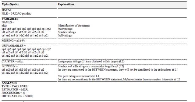 Further measures have been adopted: The correlations between trait and method factors of the same trait-method unit are explicitly set to zero, because these factors are uncorrelated by definition (Eid et al., 2008). The factor loadings of the peer ratings are set equal at both levels to avoid cluster biases (Jak, Oort, & Dolan, 2013) which does not worsen the model fit (Chen, 2007). The 30 manifest indicators are item parcels. Parcelling was necessary for reducing the complexity of the model. This is justified because the analysis primarily aimed to estimate the relations between the constructs (T. D. Little, Cunningham, Shahar, & Widaman, 2002). Because the data are not normally distributed (Eckstein, Grob, & Reusser, 2017), the distinctive Mplus estimator with robust standard errors “MLR” (Finney & DiStefano, 2013) was applied. The MLR estimator uses all information available to model missing data (Muthén & Muthén, 2017).