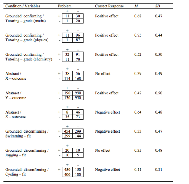 Previous work has shown that reasoners’ successful interpretations of contingency tables depend on two characteristics of the task, which are the symmetry of the problem (symmetric vs. asymmetric; Saffran et al., 2016) and the problem context (grounded vs. abstract; Osterhaus et al., 2019). Symmetric problems involve a comparison between two candidate causes (i.e., X1 leads to Y, X2 leads to Y), whereas in asymmetric problems, a candidate cause is compared to a control group, to which no intervention is applied (X leads to Y, not-X leads to Y). Symmetric problems are easier, because they seem to equally draw reasoners’ attention to all four cells. Comparing grounded to abstract contingency problems, research has shown that grounded problems (i.e., problems involving a concrete context and cover story) are easier, because they seem to afford a quicker access to long-term memory and the easier access of pragmatic cognitive schemas that might support reasoning (Osterhaus et al., 2019).