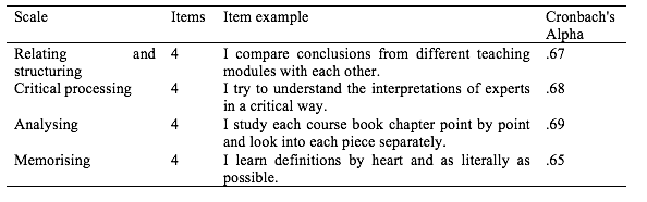In self-report questionnaires respondents are asked to answer questions about themselves and as an instrument they are widely used to measure beliefs, attitudes, feelings and opinions in diverse fields of research (Singleton & Straits, 2009). This also holds for the domain of research on learning and instruction where self-report questionnaires are often used to map student learning. Important assets of these questionnaires are that they are easy to administer in both small and large groups and that their use is time and cost-effective. However, despite the reliability, validity and advantages self-report questionnaires might offer, a critical stance towards their use is required to gain more insight into students' cognitive processing strategies (Dinsmore & Alexander, 2012). Many researchers argue that respondents are, consciously or unconsciously, not always able to respond accurately to these questions (Schellings, 2011; Schellings & Van Hout-Wolters, 2011). This inability may influence the consistency by which a respondent scores the different items of a questionnaire, and thus the reliability of its outcomes (Richardson, 2004, 2013; Veenman, 2011; Veenman & van Hout-Wolters, 2005).