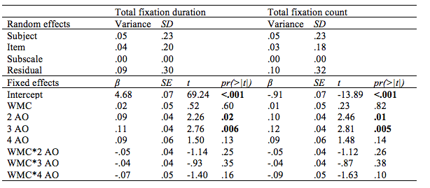 Parameter estimates of the random and fixed effects for the random intercept model for total fixation duration and total fixation count including working memory capacity