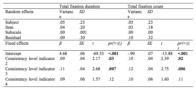 Overall, the parameter estimates showed that students with less consistent scoring behaviour spend more time on processing the items and answering options. However, this was not the case for students who picked four different answering options on a scale. This implies that there seems to be a turning point in the effect of correlation between consistency in answering behaviour and students’ eye movement measures.