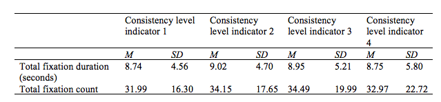 In order to answer the first research question, we report the means and standard deviations for the eye movement measures in Table 2 in relation to the consistency in answering behaviour. For example, students who were very consistent in their answering behaviour on a certain scale, that is, choosing the same answering option for each item, looked on average 8.74 seconds at an item and the corresponding answering options, and made on average 31.99 fixations on an item and answering options.