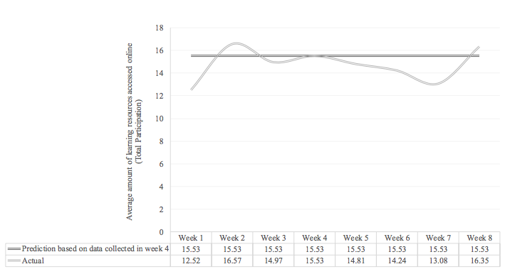 Figure 1 shows the extent to which predictions of participation based on the online trace data of week 4 and the self-reports are representative for participation in other weeks. Actual participation levels reveal that student participation fluctuates over time, with on average a peak in week 2 and week 8.