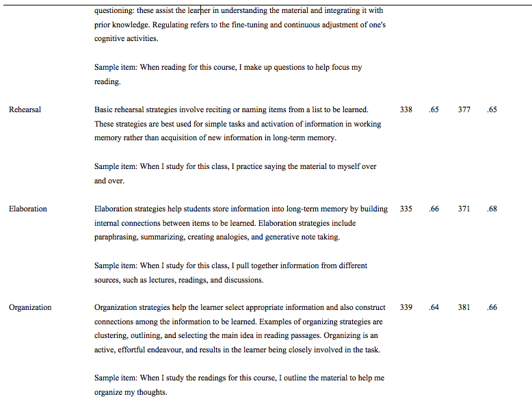 The motivated Strategies for Learning Questionnaire (MSLQ), a measure developed by Pintrich and colleagues (McKeachie et al 1985; Pintrich, 1991; Pintrich et al., 1987; see also Duncan and McKeachie, 2005, for a more in-depth discussion), was used to assess self-reports on SRL. The MSLQ was derived from an extensive body of literature and was one of the first inventory on the quality of student learning that not only included attitudes, motivation, and strategy use, but also self-regulatory strategies (Entwistle & McCune, 2004). The MSLQ was progressive at the time by including the dimension of students’ consciousness about the teaching-learning environment, leading to adaptation of ways to tackle academic work (Entwistle & McCune, 2004). Several studies argue that there is piecemeal evidence for the scale structure of the MSLQ (Hilpert et al., 2017), yet, to this date, this inventory for students in higher education is still considered relevant in light of the wide range of motivation, affect, strategy use, and self-regulation it covers. Appendix A provides a description of the scales, along with a couple of sample items per scale.