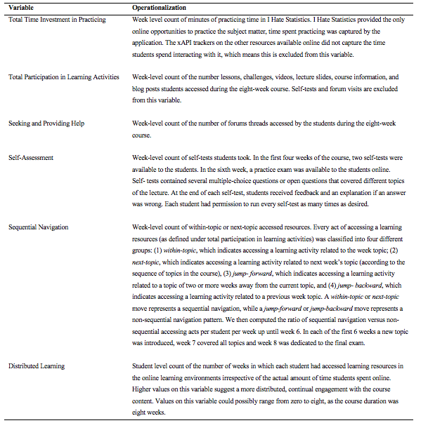 Interpretation of Online Trace Data in Week- and Student Level Variables